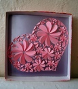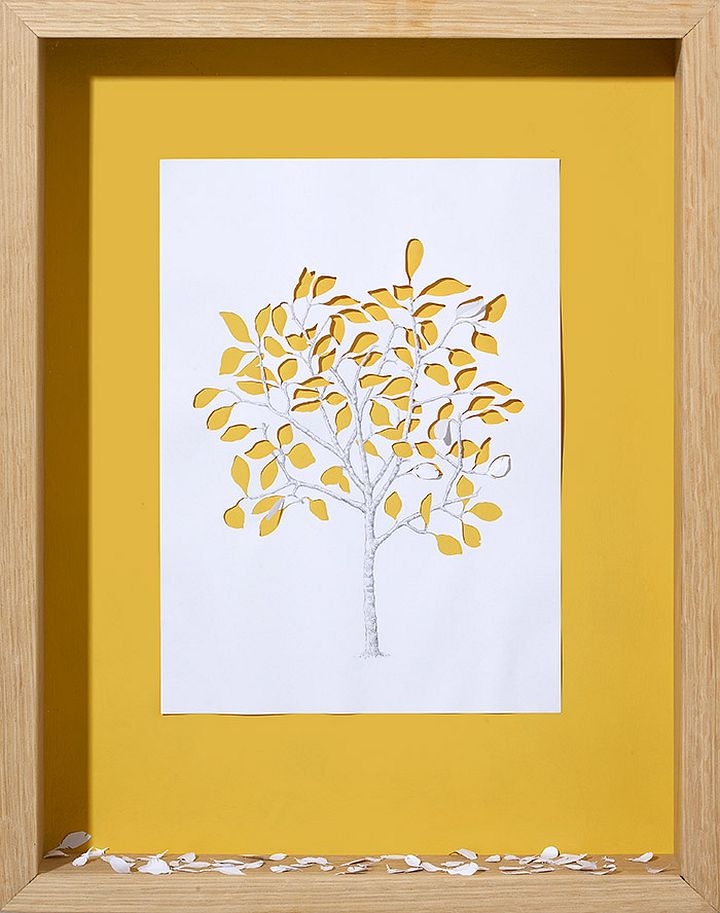 Вклеиваем цветочный круг в рамку с фоном с помощью двустороннего скотча на вспененной основе, затем на круг приклеиваем дерево — тоже на вспененный скотч для придания нашей картине объемного эффекта.