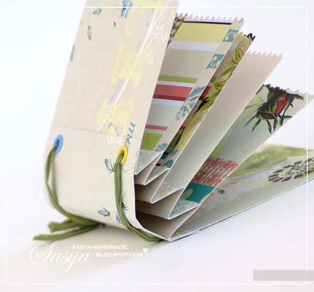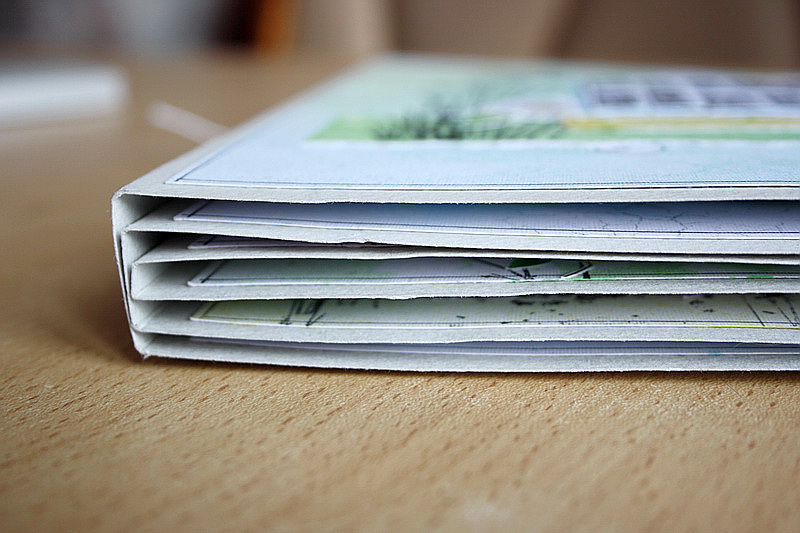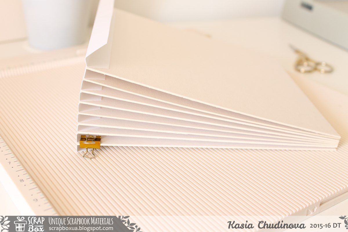 По краям следите за тем, чтобы страницы вдоль приклеивались ровно. Крайние страницы приклеиваю из кардстока. На фото видно голубую акварельную бумагу, которую я использовала.