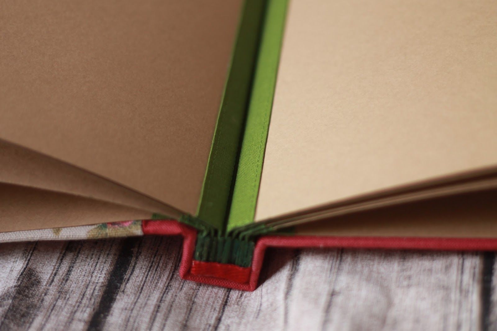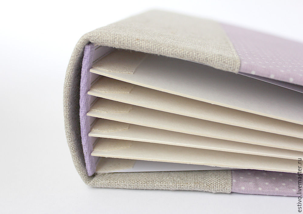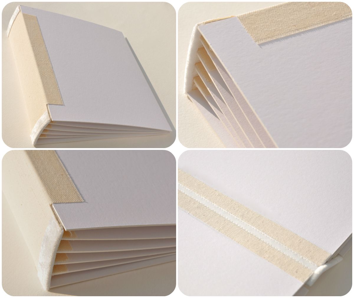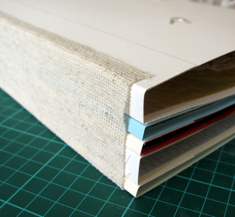 На случай, если вдруг (хотя такого никогда не было) за время пользования альбомом бумага на корешке начнет обтрепываться, закрепляем все тканью. Я использовала лен, иногда использую хлопок или марлю.