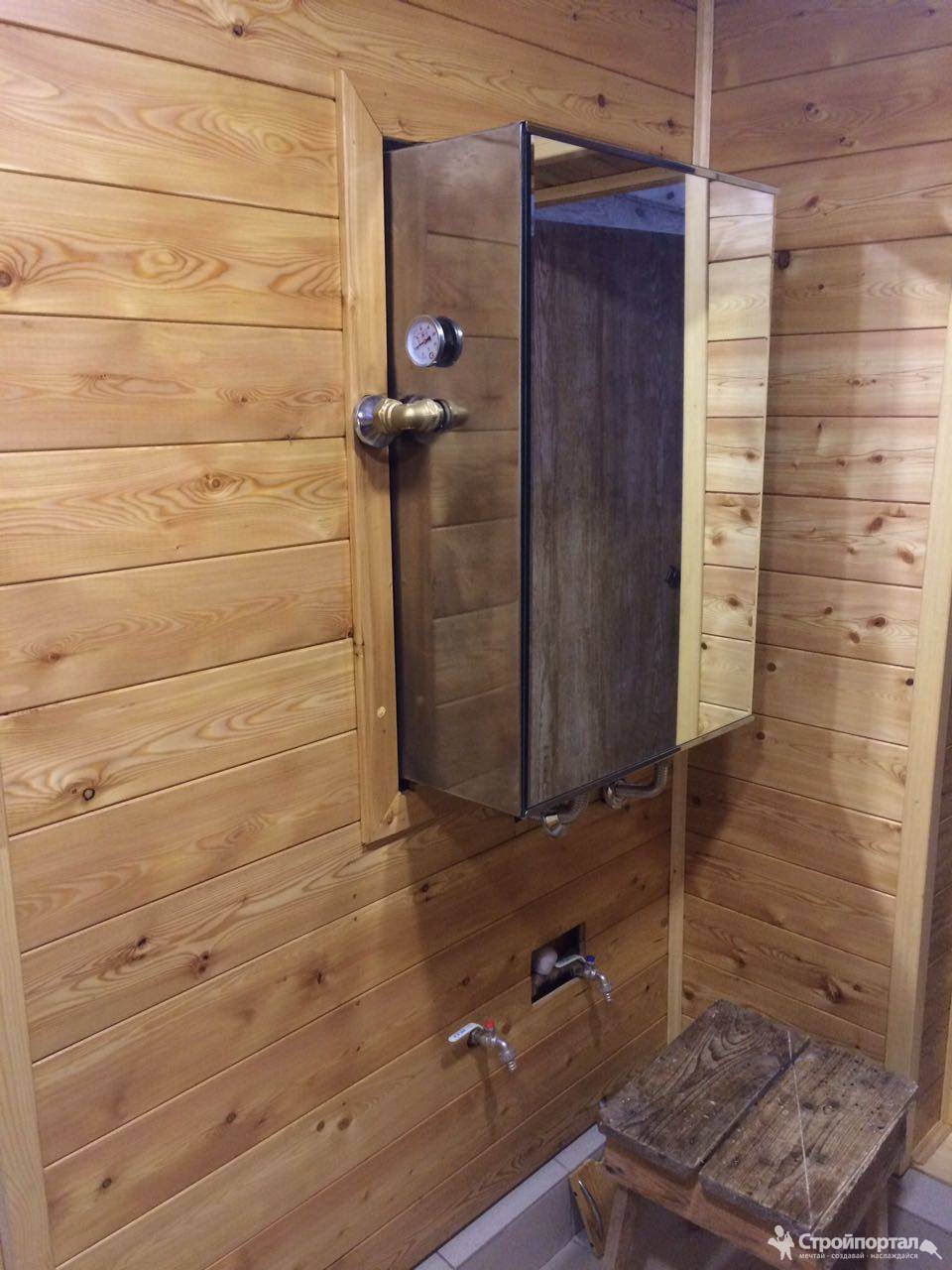 Отдельно расположенное помещение мойки требует подвода как минимум горячей воды. Если нагрев предполагается от основной печи, следует заранее продумать планировку помывочной таким образом, чтобы ввод в неё воды из парной был удобен.