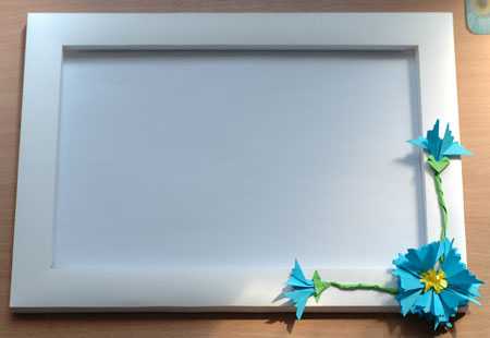 Заключительный этап – сгиб листа по расчерченным линиям таким образом, чтобы получилась рамка. Для того чтобы конструкция была более прочной, углы необходимо вставить один в другой. Рамочку можно раскрасить любимыми цветами, оформить бумажными или картонными орнаментами. Не рекомендуется накладывать тяжелые декоративные элементы.