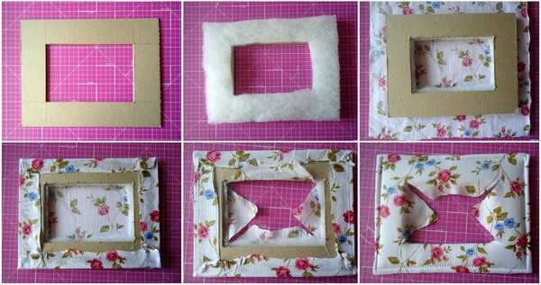 Интересный вариант – украсить рамку из картона тканью, как на фото ниже.