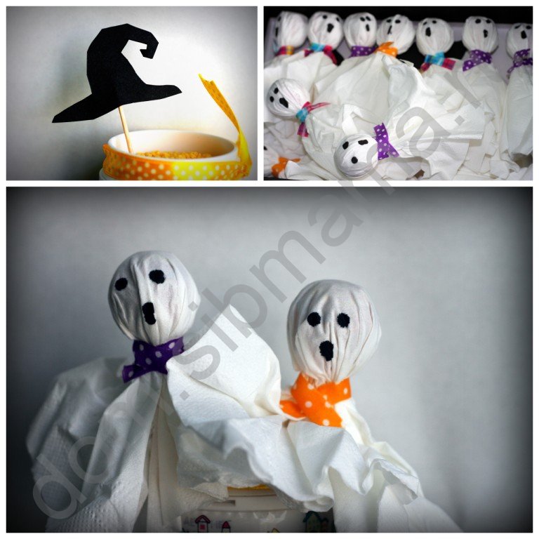 Такие привидения делать очень просто — их можно накрутить целую кучу и использовать как подарки гостям или призы для конкурсов. Раньше я внутрь вкладывала орешки, но в этот раз собираюсь накупить чупа-чупсов и сделать поделки уже из конфет — так детям понравится больше:)