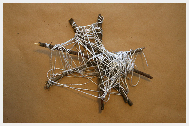 Сначала нужно взять 3 или 4 нити и сформировать из них основу паутины. Нитки должны пересекаться в центре, а закрепить их можно при помощи скотча или гвоздей. Каждая нить, после пересечения в центре крепится к внешнему краю (таким образом, из трех длинных нитей получится шесть нитей основы).