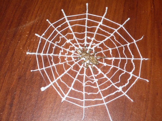 Если вам негде закрепить плетеную паутину, попробуйте сделать ее из ниток, смоченных в клее. После высыхания такая паутина станет плотной, ее можно будет прикрепить куда угодно.