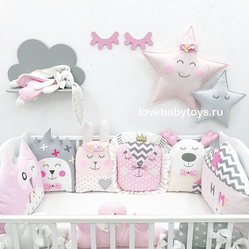 Вариантов декорирования великое множество. Однотонную ткань можно украсить вышивкой, сухим валянием, аппликацией. Стилизованным бортиком могут стать зафиксированные на стенках кроватки подушки – кошечки, рыбки, кораблики, тучки. Выбор таких подушек в магазинах достаточный, но и самим изготовить их несложно.