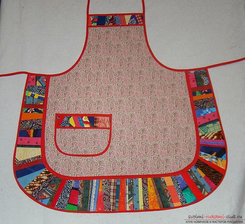 После того, как выбрана ткань, фасон и сделана выкройка, переходят к этапу пошива. Кухонный фартук с нагрудником сшивается следующим образом: