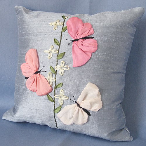 Подушки, украшенные лентами, со стороны выглядят как настоящее произведение искусства. На самом деле, лентами разных цветов и ширины отделываются наволочки, но сути дела это не меняет. Итак, приступим.