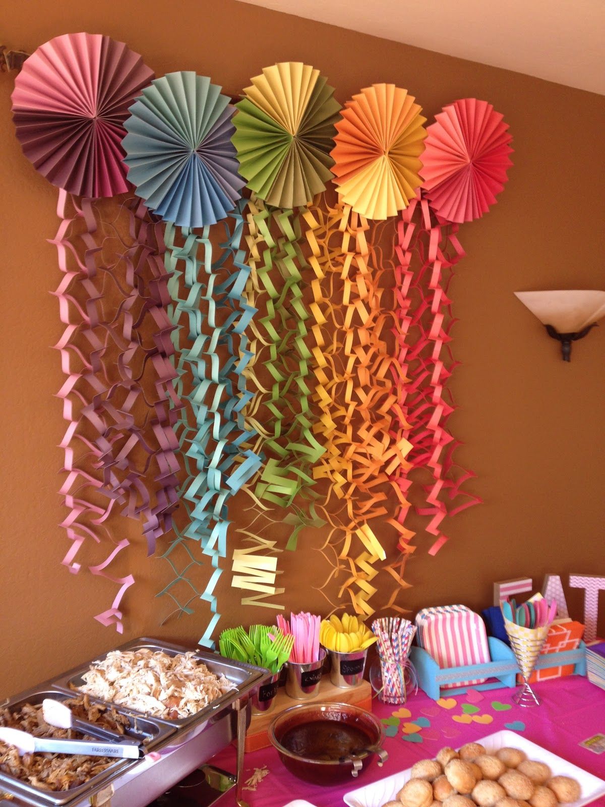 Потолок можно украсить разноцветными лентами, направив их от люстры к стенам