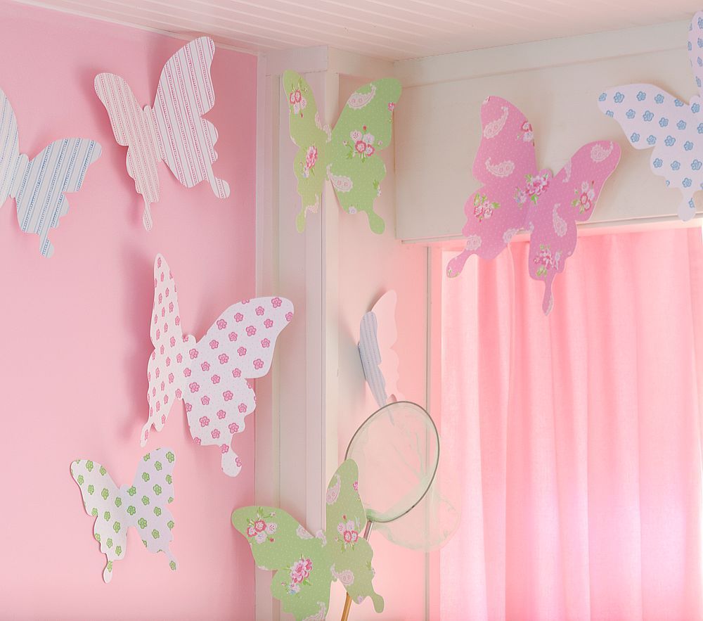 - Вырежьте из цветной бумаги цветочки, бабочки, машинки – все, что угодно, лишь бы это нравилось вашему ребенку. Можно также распечатать картинки на принтере и тоже вырезать. Расклейте все это по стенам с помощью двустороннего скотча.