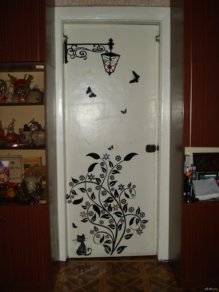 Оформление межкомнатной двери Декорирование дверей виниловыми наклейками Еще один интересный и простой метод.