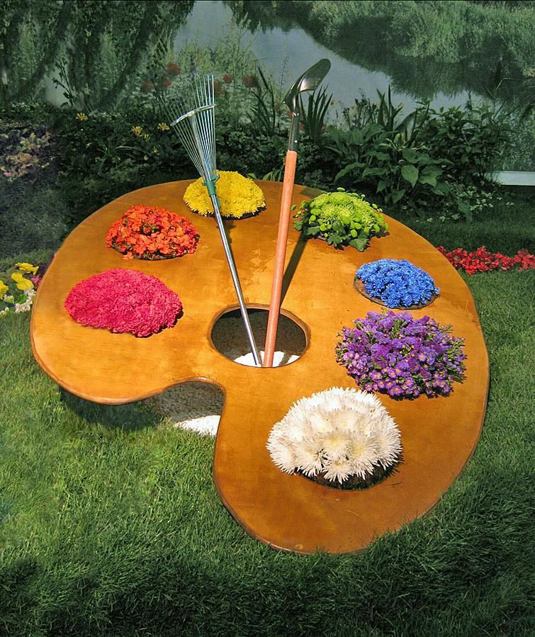 Если территория вашего сада позволяет, то можно сделать большое, массивное украшение, используя, например, телегу или специально собранную в какой-нибудь интересной форме (лодки, избушки) композицию из досок. В таких случаях оформляется один большой цветник, внутрь или поверх которого ставятся отдельные кашпо с цветами.