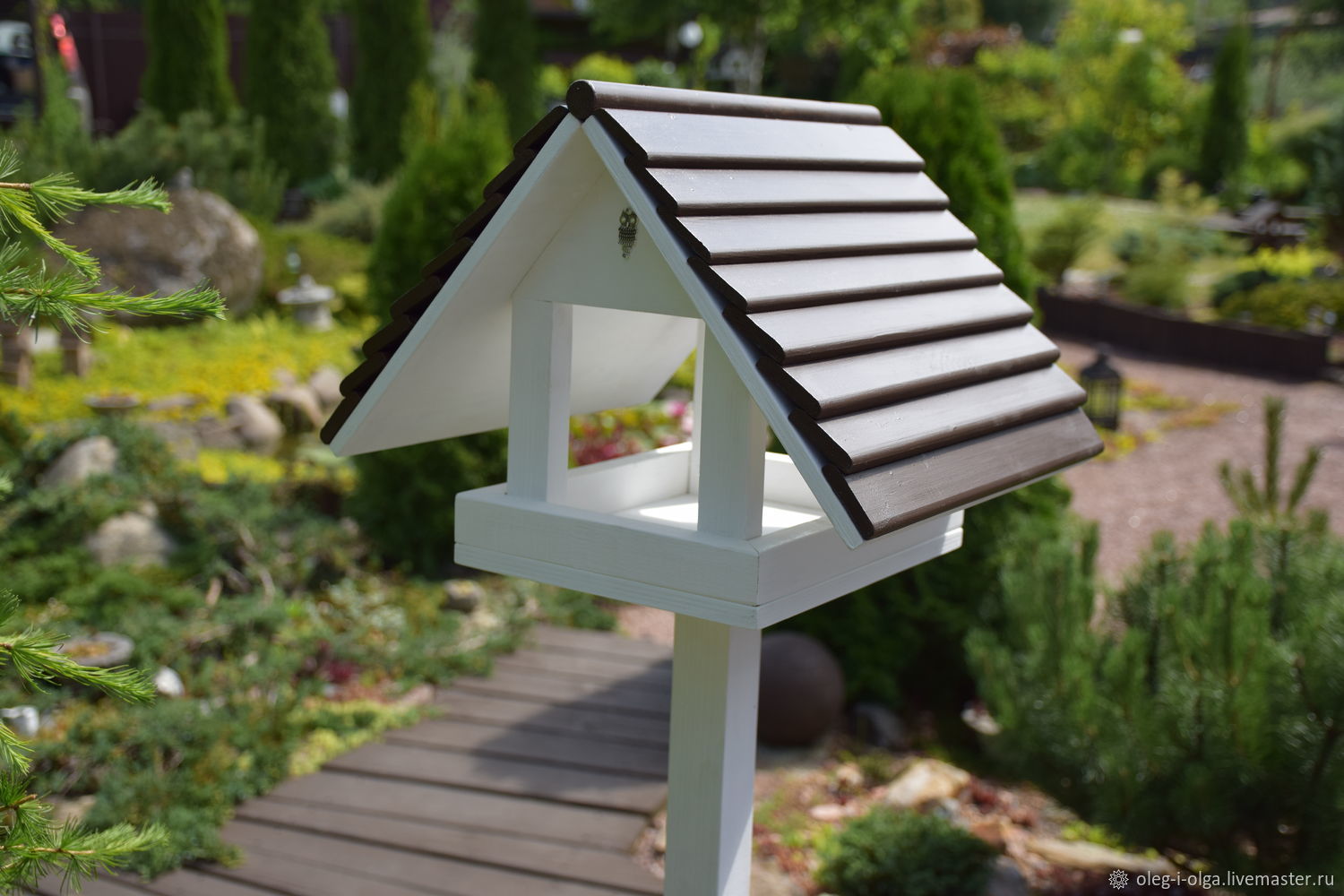 Вариант кормушкиНа фото можно видеть, как сделать простую конструкцию. Перед работой сделайте чертеж с размерами. Качественные и простые схемы и чертежи вы можете найти в интернете. Это позволит уменьшить расход материалов, а также выполнить правильный раскрой.