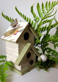 - Иногда скворечник оформляют в технике декупаж. Это займет некоторое время и потребует аккуратности, но зато и результат будет впечатляющим.