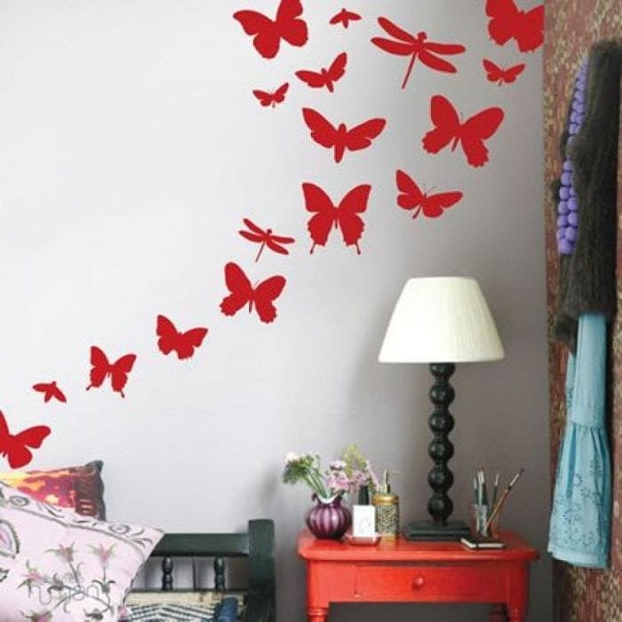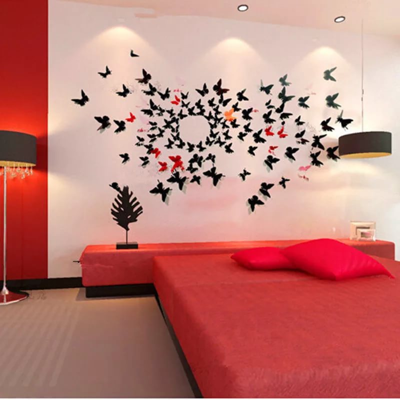 Популярным вариантом, как украсить стену в комнате являются аппликации в виде бабочек либо цветочков, с помощью которых можно создать определенные рисунки на стене. Такой способ украсить пустую стену в комнате создает 3D эффект настоящих бабочек.