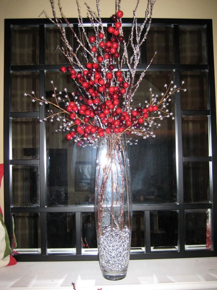наполнение стеклянной вазы зимней листвой и искусственными цветами, а также зимними ягодами.