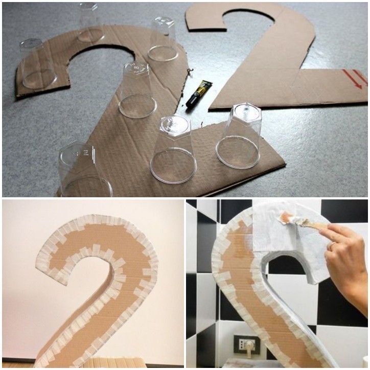 Если вы нарисуете на компьютере число в большом разрешении, его можно распечатать на нескольких листах бумаги, а затем склеить и вырезать по контуру. Полученный шаблон приложить к картону и также обвести. Должно получиться две одинаковые заготовки, их надо аккуратно вырезать, чтобы края были ровными. Кроме двух заготовок в виде чисел, нам также понадобятся полосы картона, из которых будут выполнены боковые стенки. Размер чисел может быть любым на ваше усмотрение, в зависимости от листа картона, который есть в вашем распоряжении. Боковая полоса определит ширину вашей объемной циферки. Когда у вас будут готовы все картонные заготовки, можно приступать к оформлению объемной фигурки, склеивая края малярным скотчем. Чтобы сделать ее более прочной, можно обклеить всю поверхность малярным скотчем, а сверху слоем тонкой бумаги. Иногда в полой цифре оставляют отверстие снизу или сверху, а затем наполняют ее мишурой, наподобие мексиканской пиньяты.