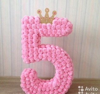 Чаще всего для цифры на день рождения своими руками мы испольщуем картон, но в данном случае хорошо за основу цифры взять пенопласт. И тогда можно смело втыкать наши цветы так, чтобы основы не было видно.