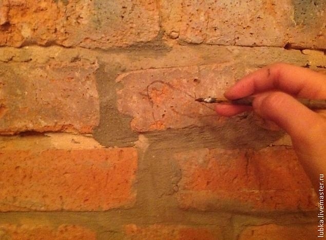 Инструменты – зубило и молоток, перфоратор. - Имитация высолов с помощью белой краски, наносимой губкой или тампоном тоже в случайном порядке. Или имитация остатков штукатурки.