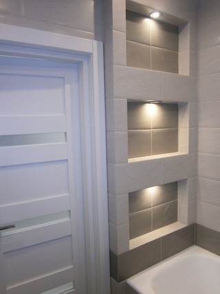 Если комната выложена черной плиткой, тогда нишу облицуют плиткой на тон светлее или, допустим, синий цвет, коричневый. Изредка делают акцент, отделав полки светлыми тонами.
