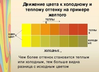 Холодный или теплый желтый цвет определяют состав данного тона: если есть хоть небольшая примесь синего (зеленого) в желтом, он считается холодным, если есть примесь красного (оранжевого, коричневого) – цвет считается теплым. Иногда в сложном оттенке этого тона есть как отголоски синего, так и красного, тогда взвешивается: какого подтона больше.