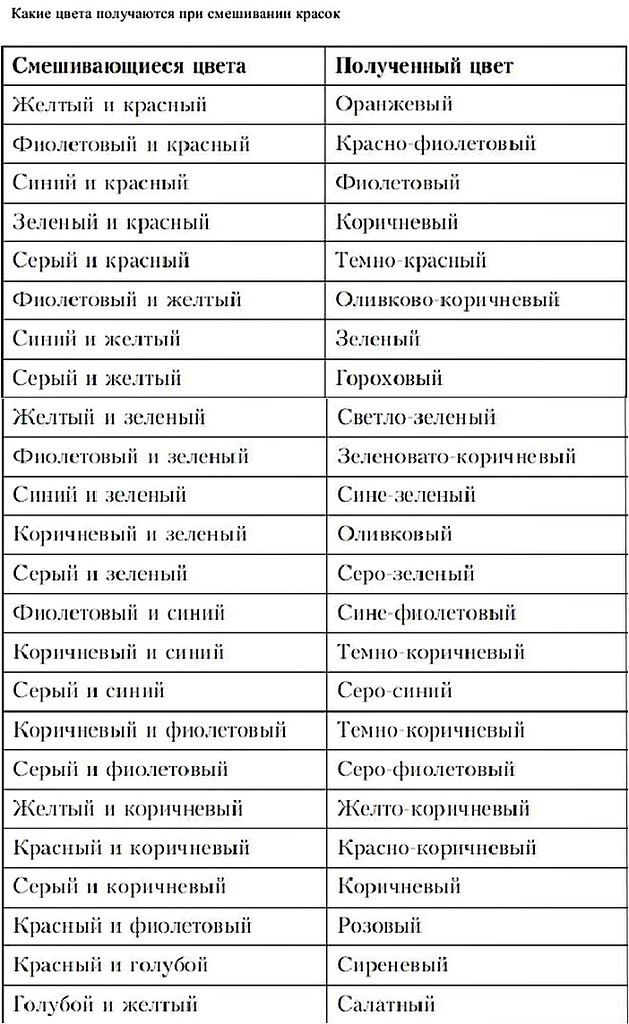 Таблица смешивания цветов 1| Требующийся цвет | Основной цвет + Инструкция по смешиванию |