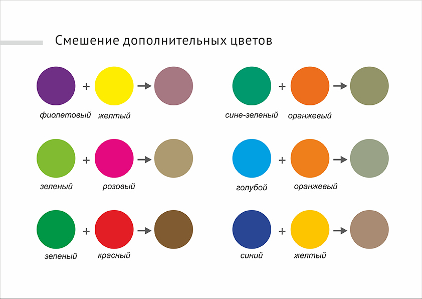 | Светло-коричневый | Жёлтый + добавить белый, чёрный, коричневый |