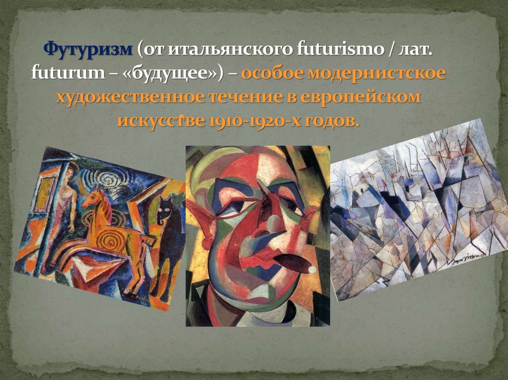 Модернизм отвергает принцип систематически организованного философского рассуждения, ставит под сомнение саму способность слова выражать глубинное содержание миросозерцания. Так возникает футуризм — художественное течение, отражающее ускорение темпа жизни, абсолютизирующее идеи движения (поэты Ф. Маринетти и Г. Аполлинер, В. Маяковский, художники К. Kappa, Дж. Северини и др.), атакже имажинизм — особое нелогическое художественное соединение метафор и образов (А. Мариенгоф, С. Есенин).