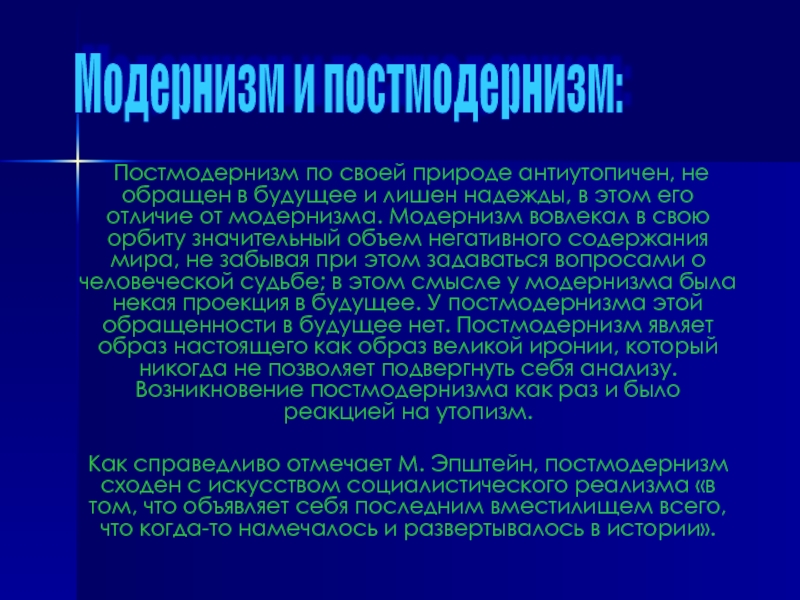 Таким образом, суть модернизма не в тех или иных формах искусства или сфер человеческой деятельности, а в тотальном разрыве культуры со всей ее бытийной средой — природой, обществом, человеком, что сделало само ее существование трагическим, вызвало апокалипсическое ощущение «заката Европы» и мрачный пессимизм всевозможных антиутопий, предрекавших гибель цивилизации.