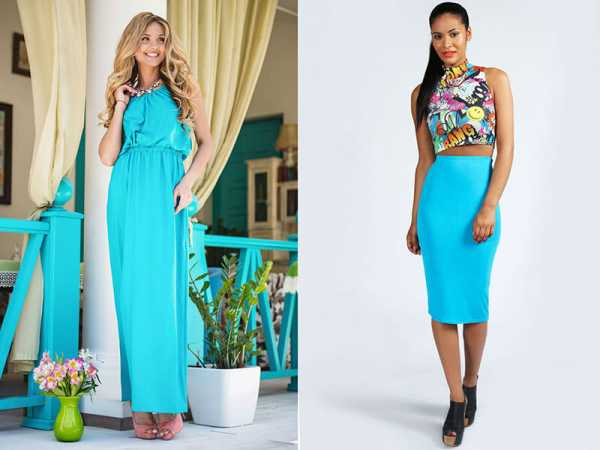 Он тоже считается бирюзовым. Это более спортивный вариант, такого цвета часто бывают футболки. Но платья, посмотрите, выглядят тоже прекрасно. Этот голубо синий яркий оттенок по-своему нежен и больше подойдет для отдыха, праздников, спорта, чем для офиса.
