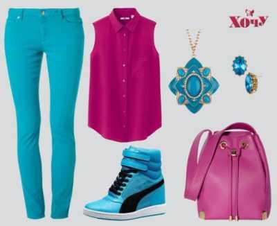 Именно благодаря родственности эти оттенки изумительно гармонируют друг с другом, выглядя свежо. Чтобы создать большую контрастность и привнести в свой облик роскоши и аристократичности, наденьте ультрамариновые синие брюки с тонкой бирюзовой блузкой, подобрав к ним небольшой стильный клатч.