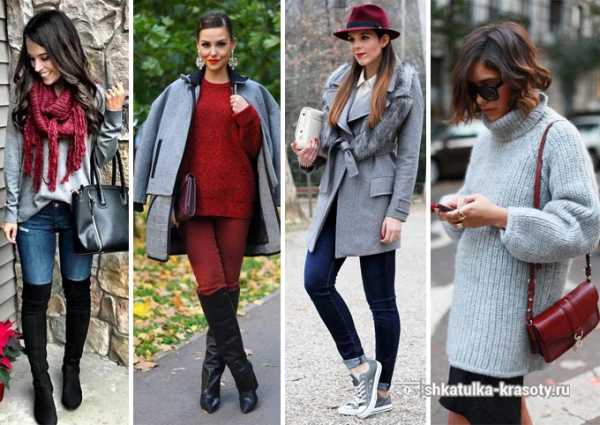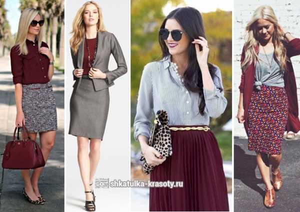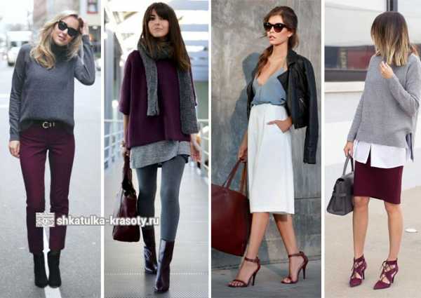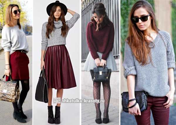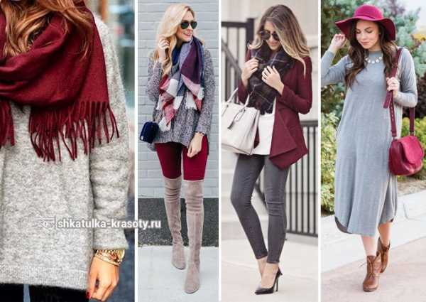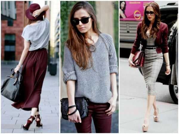 Использование в сочетании с бордовым светло серых оттенков – наиболее удачный вариант. Он придает образу женственность, особый шарм, очарование.