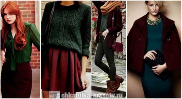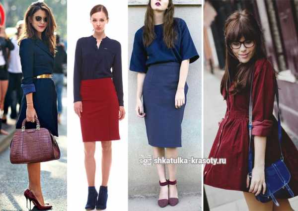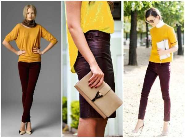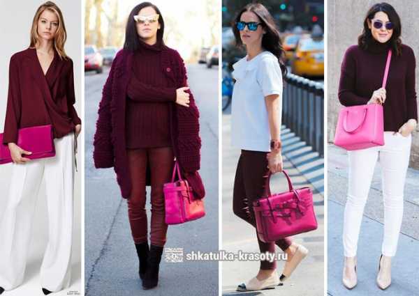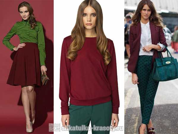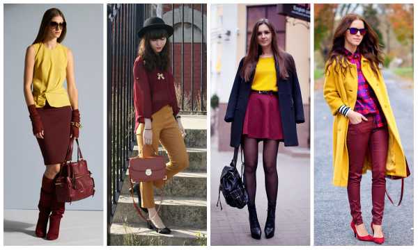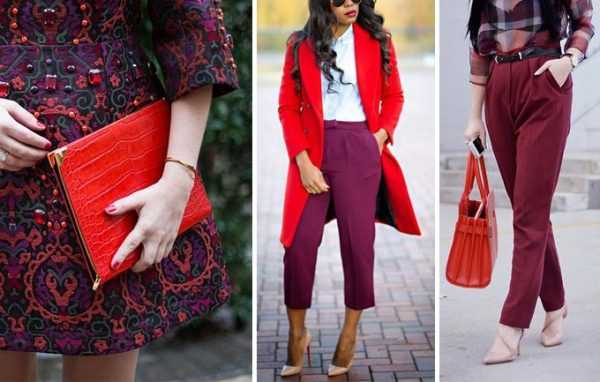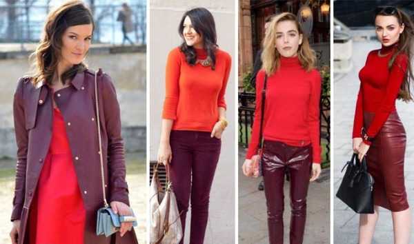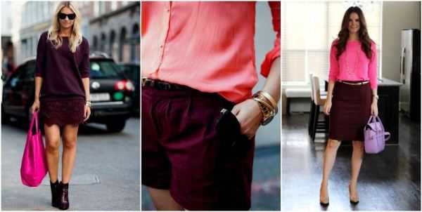 С какими цветами составить сочетание бордового зависит так же от его оттенка и назначения: так комбинация с яркими тонами относятся больше к вечернему стилю, а с нейтральными – для офиса и повседневной одежды.