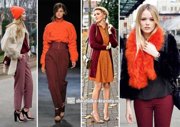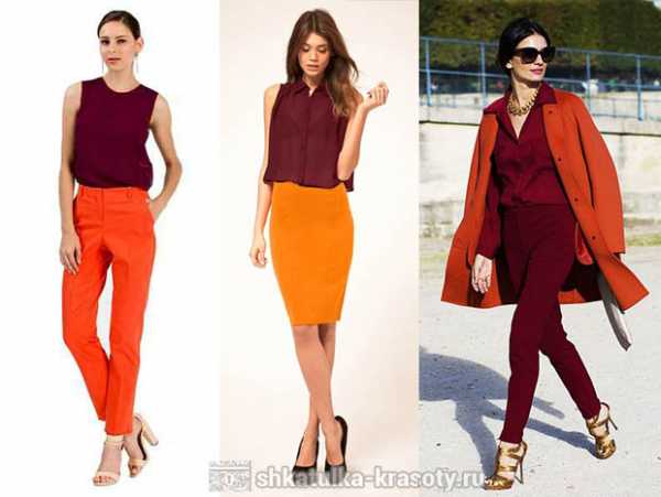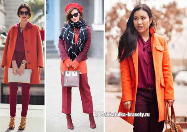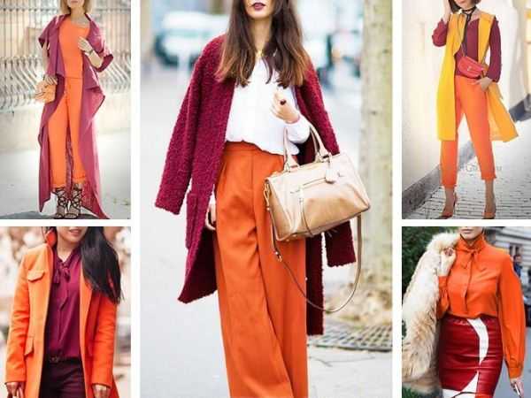 Сочетание цветов: бордовый и оранжевый – насыщенная, теплая и привлекательная палитра. Как и теплый розовый, оранжевый построен на основе красного, но в отличие от предыдущих тонов – имеет в себе желтый цвет. Это придает пикантность сочетанию. Легкий тепловой контраст, который делает описываемый тон холоднее, контраст яркого пятна, а также световой – все вместе дают эффектный лук. Для примера, рассмотрите сочетания с персиковым, оранжево-коралловым, морковным, красно-оранжевым, кирпичным.