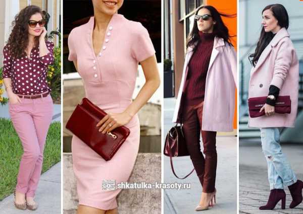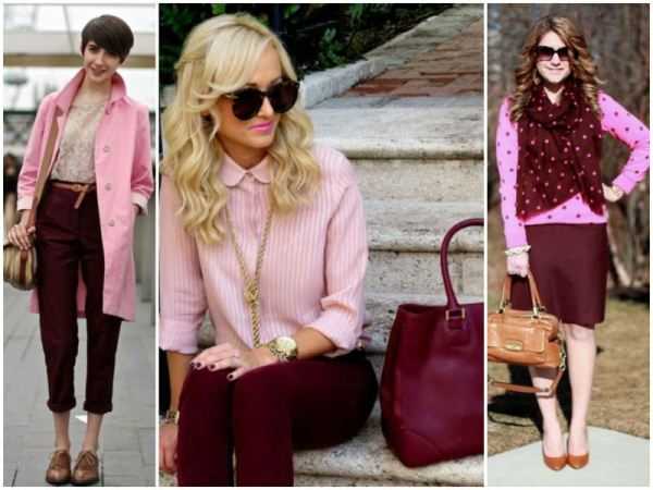 Красный и розовый — красный усиливает яркость, поэтому детали этого цвета должны быть в умеренном количестве, чтобы наряд не выглядел слишком броским. Розовый наоборот создает утонченные, спокойные, нежные образы. Рядом с насыщенным бордо розовый смотрится еще нежнее и мягче.