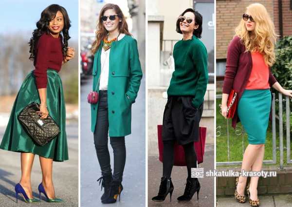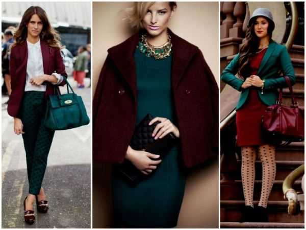 Сочетания с ярким оттенком бордового могут быть контрастными, как с бледными, так и со светлыми яркими тонами, однако особой привлекательностью обладают сочетания с темными цветами, такими как черный, темно-синий или темно-зеленый.