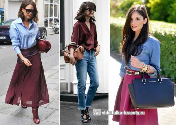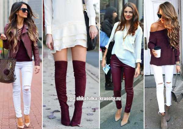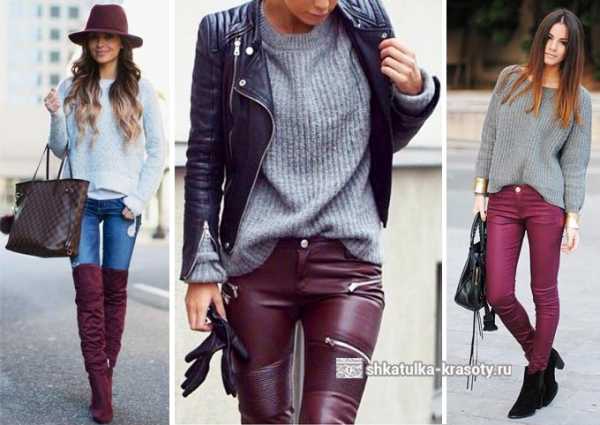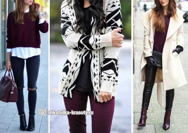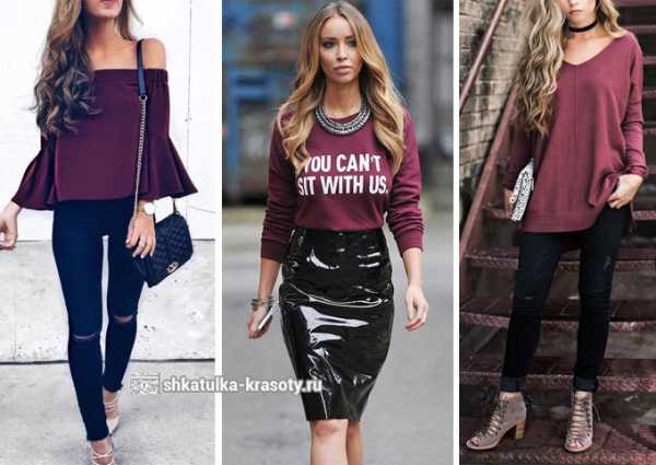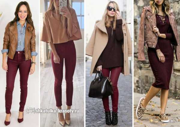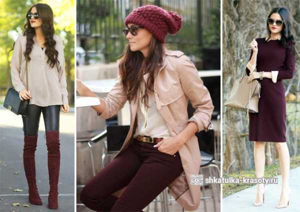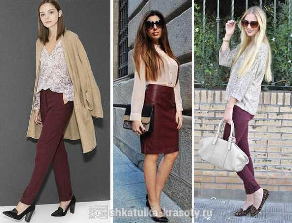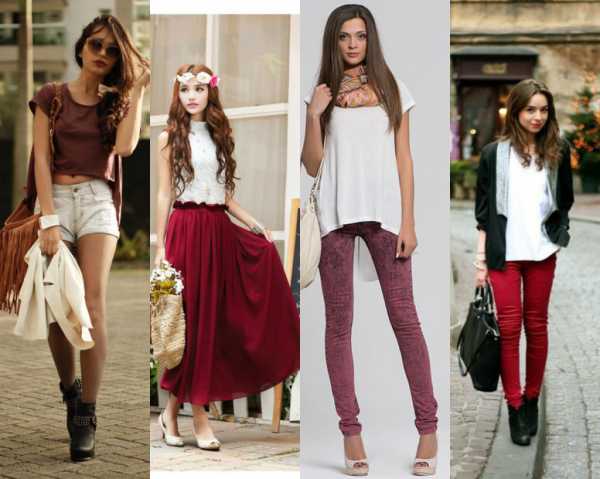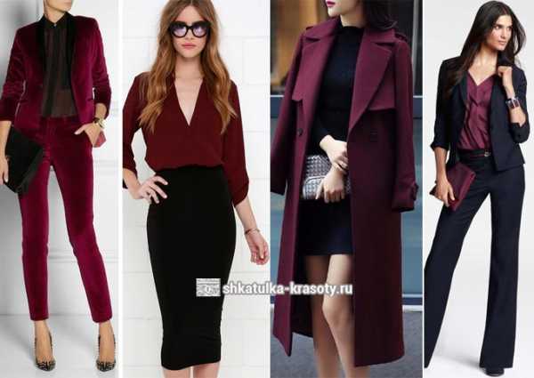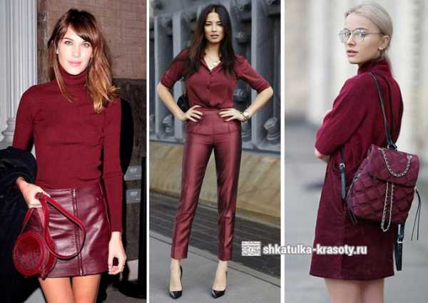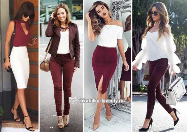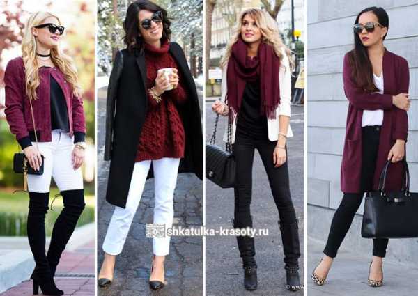 Бордовый цвет в одежде всегда подчеркивает красоту женщины: стройнит, увеличивает контраст внешности, выгодно оттеняет лицо, а сочетание с этим тоном могут создавать различные образы: стильные, игривые, броские и элегантные.