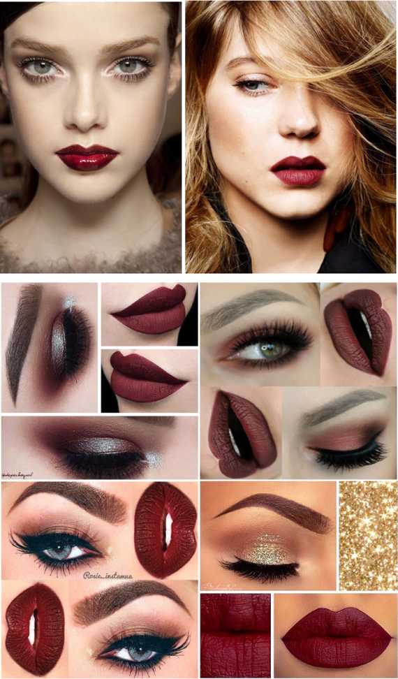 Часто бордовую помаду поддерживает темный макияж глаз, а порой и присутствие там бордового цвета придает образу сказочно-загадочный тон. Для углубления этого эффекта используйте тени с перламутром: с бронзовым, золотым, медным тоном. Для более глубокого цвета, в паре с бордовым, используйте черный, темно-коричневый, серый, зеленый хаки, золотой и даже белый.