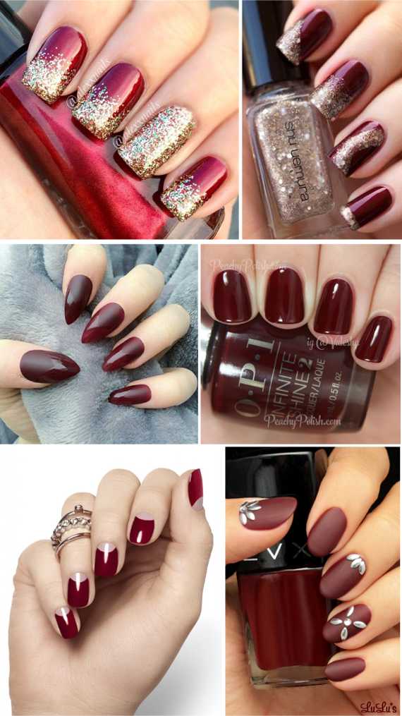 Сочетать бордовый лак можно с бежево-розовым, черным, золотым, белым, серым цветом. Блестки сделают маникюр празднично вечерним, а черный цвет – готичным.