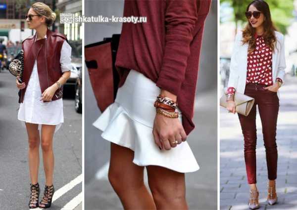 Сочетание бордового с белым выигрышно для обоих цветов. Такая комбинация усиливает глубину, насыщенность бордо, подчеркивает безупречность, праздничность белого. Наряд будет умеренно праздничным для офиса и изысканным, ярким для вечеринки. Гармоничным будет комплект, содержащий оба цвета в равных пропорциях.