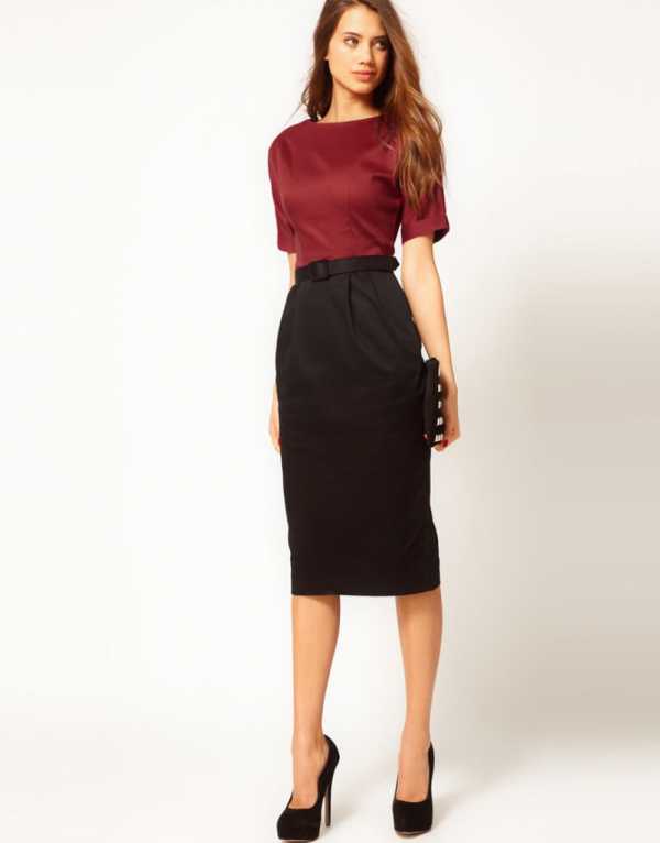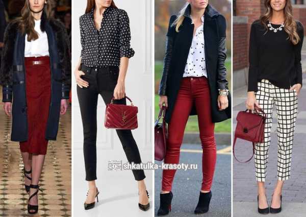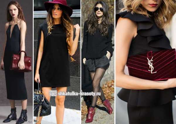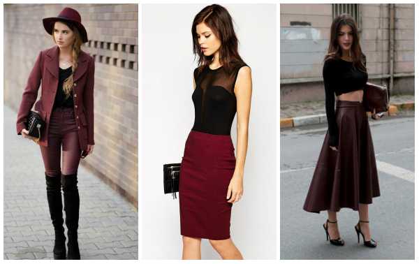 Использование черных деталей и аксессуаров в наряде цвета бордо придает строгости, контрастности, добавляет элегантности. Бордовое платье и черные перчатки или клатч – беспроигрышный классический вариант вечернего наряда. Насыщенный бордовый верх и черный низ – отличный вариант для офисного комплекта одежды.