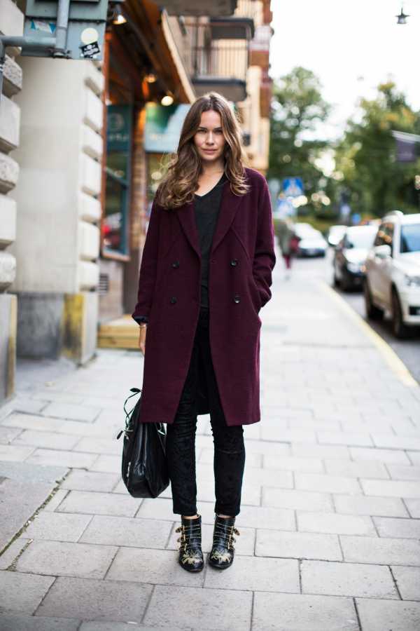 Одно из самых обыденных и классических решений для бордового цвета в одежде можно считать сочетание его с черным. Черный цвет олицетворяет сдержанность, строгость, некоторую таинственность. Есть риск, что в одном комплекте черный и бордовый будут выглядеть мрачно и удрученно. Чтобы этого избежать остановите свой выбор на более насыщенных и светлых оттенках винного. → ЧЕРНЫЙ — только стильные образы >>>