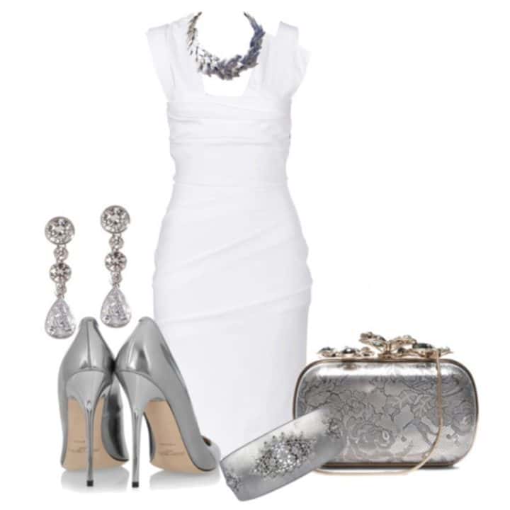 Серебристый тон привносит в облик блеск и мерцание. Платья этого оттенка — отличный вариант для вечеринок. В данном случае необязательно разбавлять цвет элементами другой палитры. Наденьте однотонное платье с туфлями в тон, и неповторимый лук готов.