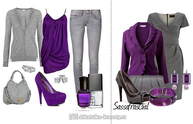 Серый цвет удачно компонуется с фиолетовый, образуя свободную, спокойно гамму. Чаще всего пару разбавляют джинсовым и белым.