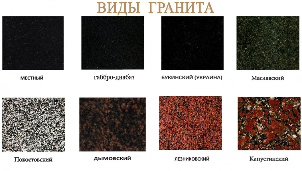 Наиболее популярные у нас виды гранита это Габбро-диабаз, Black Galaxy (чёрные), Лезниковский, Империал Ред (красные), Масловкий, Green Ukraine (зелёные), Дымовский, Елизовский (коричневые) и другие.