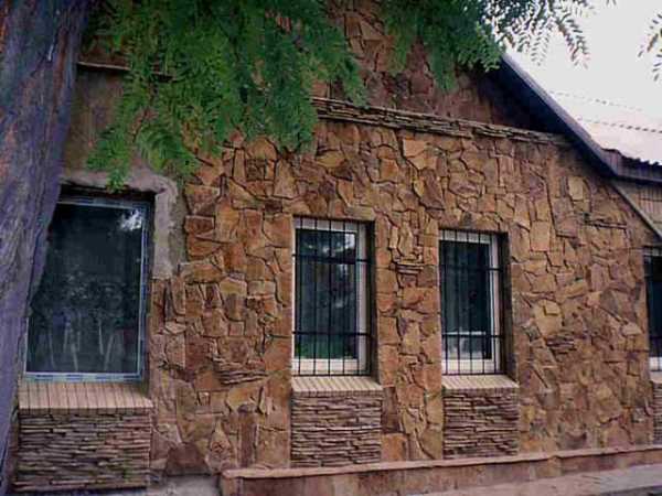 Песчаник прочен и долговечен и, что важно, доступен по цене. Стены, отделанные песчаником, имеют шероховатую поверхность. Оттенки камня варьируются от бежевого до насыщенного коричневого цвета. Эффектнее всего использовать для облицовки наружных стен песчаник контрастных оттенков, это позволит выделить отдельные участки фасада или оформить углы, колонны, дверные и оконные проёмы.
