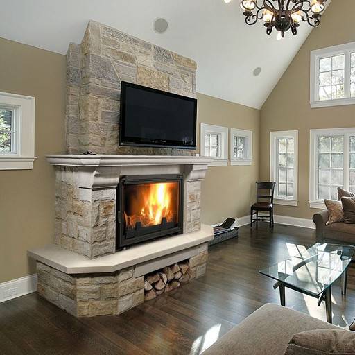 Камин из натурального камня декорируют плиткой или деревом, часто окрашенными в светлые оттенки и имеющими эффект обшарпанности и потертости.