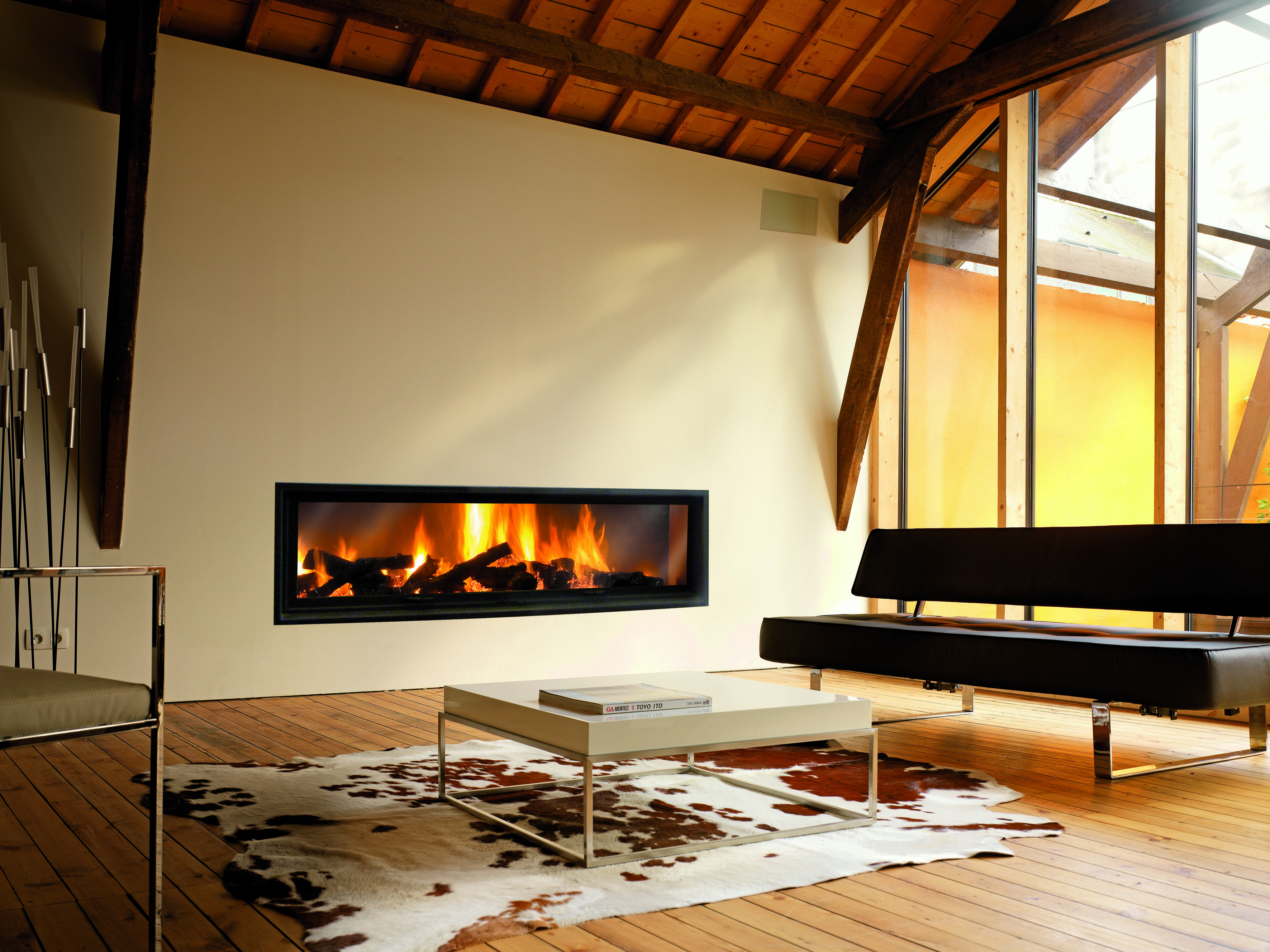 Деревянный и чистый современный камин создают неповторимый стиль.