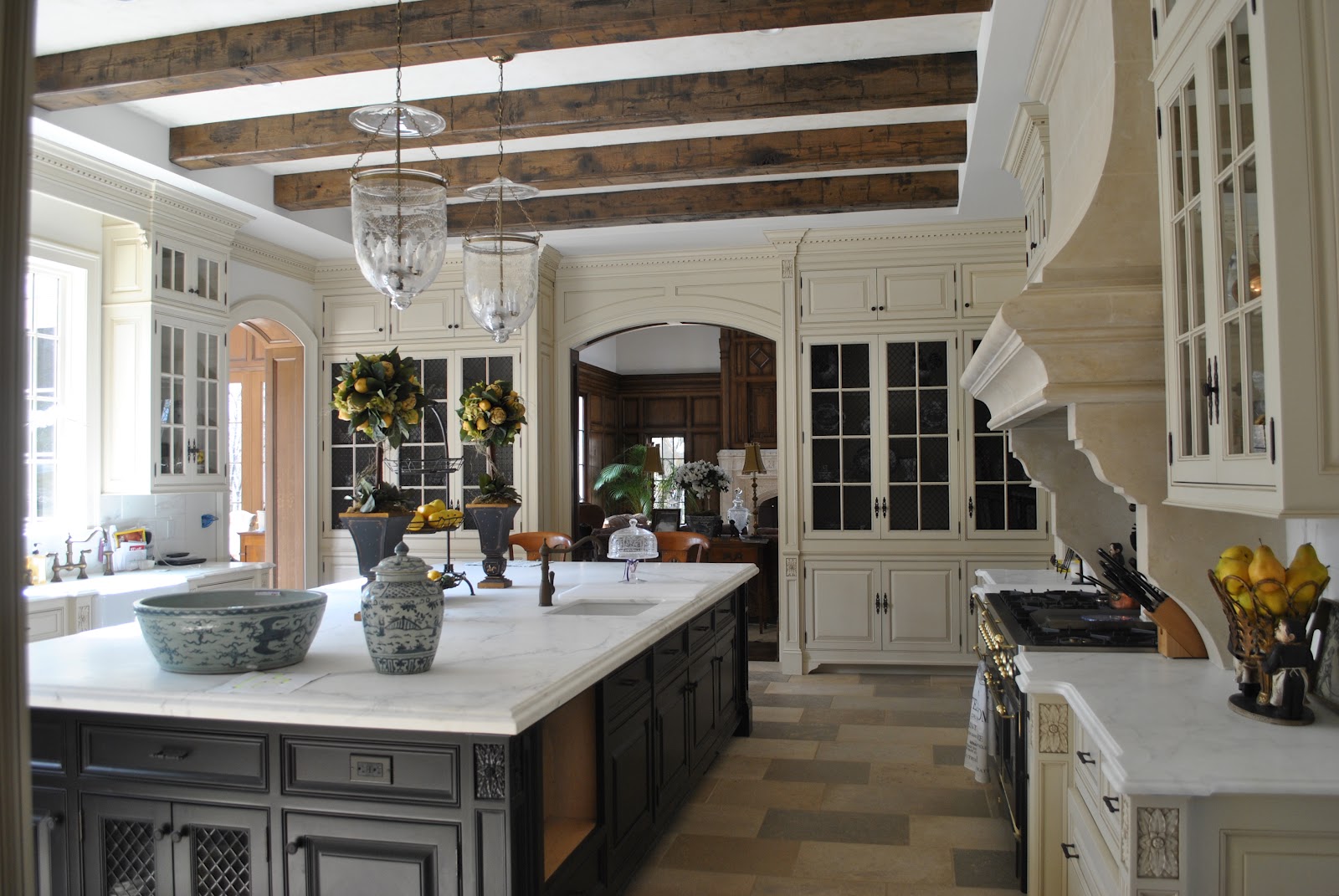 Поскольку в помещении уже используются различные тона дерева на полу, потолке и других предметах мебели, кухня приобретает более мягкий неоклассический вид, чтобы смягчить смелые цвета дерева.На всей кухне используются белые шкафы с белыми мраморными столешницами для создания бесшовного вида, а также черные кованые аксессуары и предметы мебели, чтобы действительно передать ощущение кантри.