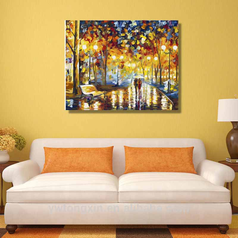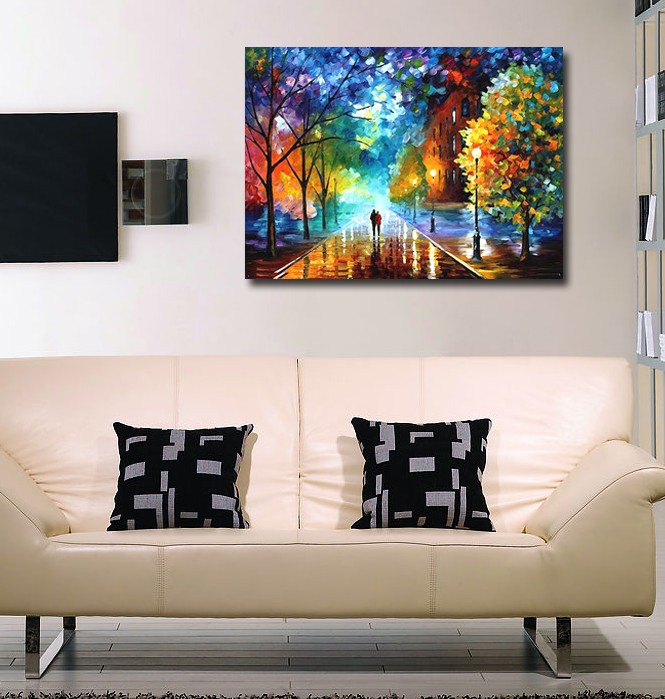 Гостиная обычно расположены в просторной комнате. Здесь можно отвести для картины целую стену — например, над мягким диваном. В гостиной картины могут быть рассредоточены по разным стенам, составлять композицию иди доминировать в единственном числе на самом видном месте.